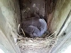 The growth of nestling tree swallows is influenced by their environment. In both younger and older nestlings (those between two and four days old and between nine and eleven days, respectively) growth is positively influenced by a higher maximum temperature, particularly in the former. A later hatching date negatively impacts growth, especially for younger nestlings. Older chicks grow somewhat faster when insects are abundant. Growth in younger nestlings increases with age, while in old nestlings, it decreases as they get older.[63] Young tree swallows are able to thermoregulate at least 75% as effectively as the adult at four to eight days old when in the nest (depending on the size of the brood), and at 9.5 days of age when out of the nest.[64] The nestlings fledge after about 18 to 22 days, with about 80% fledging success. Like hatching success, this is negatively affected by unfavourable weather and a younger female.[12] Chicks may be preyed on by snakes[65] and raccoons.[66] This predation can be exacerbated by begging calls.[67]