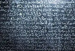 The Rosetta Stone (British Museum EA24) is a granodiorite stele, found in 1799, inscribed with three versions of a decree issued at Memphis in 196 BC during the Ptolemaic dynasty on behalf of King Ptolemy V. The top and middle texts are in Ancient Egyptian using hieroglyphic and demotic scripts, respectively, while the bottom is in Ancient Greek. As the decree has only minor differences between the three versions, the Rosetta Stone proved to be the key to deciphering Egyptian hieroglyphs.