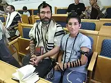 אַ ייִדישער טאַטע און זײַן זון זיצן מיט אַנדערע ייִדן אין אַ שול