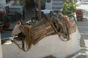 - (countable) a saddle, a packsaddle (typically of an ass)