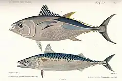 From Greek σκουμπρί (skoumprí), from Ancient Greek σκομβρίς (skombrís), from σκόμβρος (skómbros).