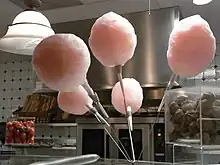 - cotton candy; Candy made from melted sugar spun into thin threads and collected into a mass, usually on a stick.