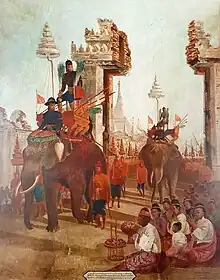 A war elephant with an officer stationed on its back and a warrior seated on its neck.