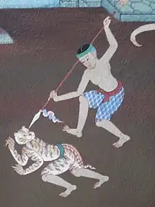 the tiger spirit being captured, a mural painting at Wat Kaeo Phaithun, Bangkok