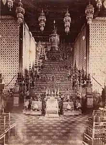 From corruption of มัญจา (“bed”), from Pali mañca (“bed; couch; sofa”), and perhaps influenced by เบญจ (“five”), corrupted form of ปัญจ (“five”), from Pali pañca (“five”). Compare Khmer បញ្ច (bɑñcɑɑ, “decorated stand supporting a box containing the ashes of a deceased person”).