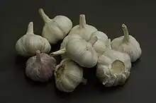 From Old Georgian ნიორი (niori), borrowed from a Northeast Caucasian language: compare Lak нур (nur, “a kind of weed with edible root”), Tabasaran нюгьр-ер pl (njuhr-er, “mint”), Tsakhur нуъйе (nuʔjä, “mint”) etc. and see the Lak entry for more.[3]