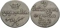 Both sides of a Georgian coin. This word is written on the left-hand coin
