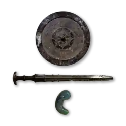 やさかにのまがたま (Yasakani no Magatama): an artist's depiction of the (unseen) Imperial Regalia of Japan, showing the Yasakani no Magatama as the jade jewel on the bottom.