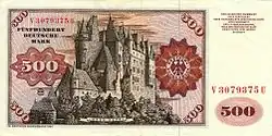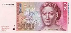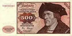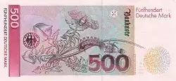 Fünfhundertmarkschein m (strong, genitive Fünfhundertmarkscheines or Fünfhundertmarkscheins, plural Fünfhundertmarkscheine)