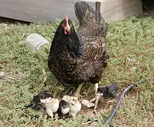 From Middle High German klucke, derived from the verb klucken (“to cluck”), from Proto-Germanic *klukkwōną, of onomatopoeic origin. The g- by dissimilation.