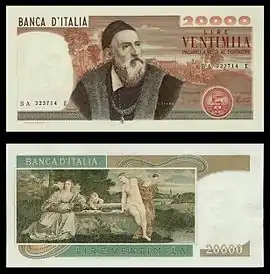 Tiziano raffigurato nella vecchia banconota da 20 000 lire