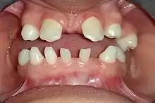 - (dentistry, teratology) The congenital absence of some or all primary or permanent teeth, caused by a rare genetic disorder.