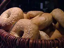 Borrowed from Yiddish בייגל (beygl), ultimately from Old High German bouc (“ring”).