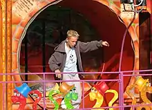 - (countable, idiomatic) large rotating cylinder in an amusement park that one can enter and in which one has to move their legs and arms to keep their balance