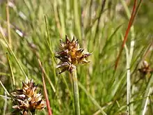 - The flower to the left is the yellow rattle, curved sedges in the middle and cottongrass to the right.