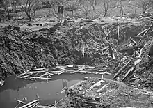 - a bomb crater (hole in the ground caused by the explosion of a large bomb)