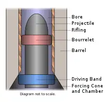 - (firearms, weaponry) An accurately machined portion around the diameter of a shell of a gun, which acts to increase accuracy of projectile fit to the barrel.