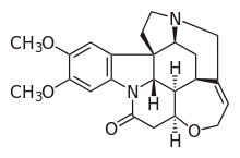 - (organic chemistry) An alkaloid related to strychnine, found in several plant species, notably Strychnos nux-vomica (nux vomica).