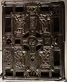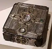 1. An elaborate ornamented metal reliquary box or case used to hold Early Medieval Irish manuscripts or relics.