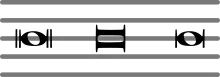 Left: double whole note in modern notation. Center: double whole note in mensural notation used in some modern scores as well. Right: less common stylistic variant of the first form.