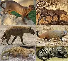 Some feliforms (clockwise from bottom left): African palm civet, spotted hyena, fossa, leopard, stripe-necked mongoose, African civet