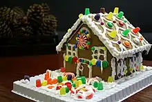 - A novelty confectionery in the shape of a house, with walls, roof and sometimes chimney made of dense, crisp gingerbread, held together with frosting and decorated with candies; popular especially at Christmastime.
