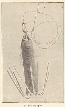 1. (nautical) A device consisting of iron claws, attached to the end of a rope, used for grasping and holding an enemy ship prior to boarding; a grappling iron.