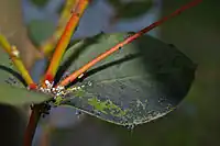 Honeydew (sense 2.2) or sooty mould on the leaf of a blue peppermint or broad-leaved peppermint (Eucalyptus dives).