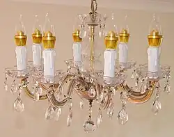 - chandelier (illumination device that hangs from the ceiling and consists of several candle or light bulb holders)
