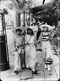 Modern girls wearing "Beach Pajama Style" walking down Ginza in 1928