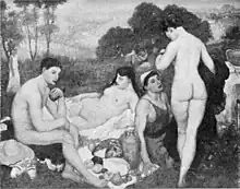 painting of nude people in a picnic.
