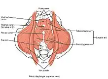 - (anatomy) A muscular partition, formed by the muscle fibers of the levator ani, the coccygeus, and associated connective tissue, which spans the area underneath the pelvis.