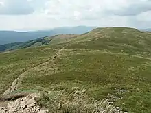Borrowed from Ukrainian полони́на (polonýna), from Proto-Slavic *polninà. Doublet of płonina, an inherited term.