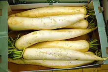 The daikon, a cultivar or subspecies of radish. It has a mild taste and is generally cooked before eating.