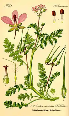 - A flowering plant in the geranium family, Erodium cicutarium, native to the Mediterranean basin.