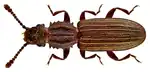 - saw-toothed grain beetle, Oryzaephilus surinamensis (pest of grain and grain products as well as chocolate, drugs, and tobacco)