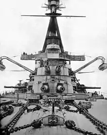 End-on view of the battleship Minas Geraes, showing her superfiring main battery.