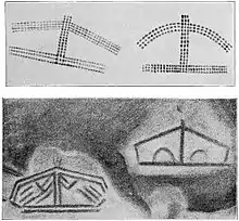 - (anthropology) A type of cave painting or engraving, having in its simplest form the shape of an upward-pointing wedge or arrow, thought to represent the roof of a tent or rudimentary building.