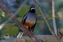 From vöröslábú (“red-legged”) + rigó (“thrush”), from vörös (“red”) + lábú (“legged”), from láb (“leg”) + -ú (“-ed”, adjective-forming suffix).