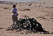 A person next to a welwitschia in the Namib desert.