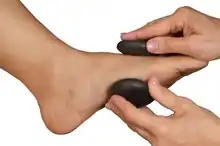 In this stage of zone foot therapy, heated stones massage the top and bottom of the foot, avoiding any bony prominences.
